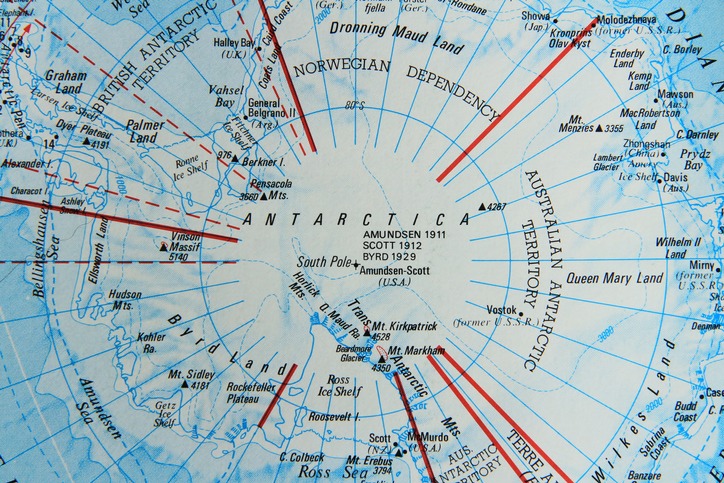A map of Antarctica, centred on the South Pole and noting all the mountains and their heights and as far out as the ice shelf and surrounding seas.